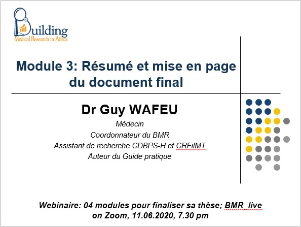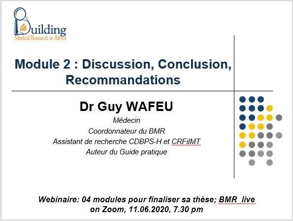 Ce cours est constitué de plus de 13 modules fondamentaux pour s'initier à la recherche en santé. Les 07 premiers modules sont disponibles sur notre page Youtube sur le lien suivant: https://youtube.com/playlist?list=PLcSODAm9HdcwQUFxATofQYPNwWwAZDstZ